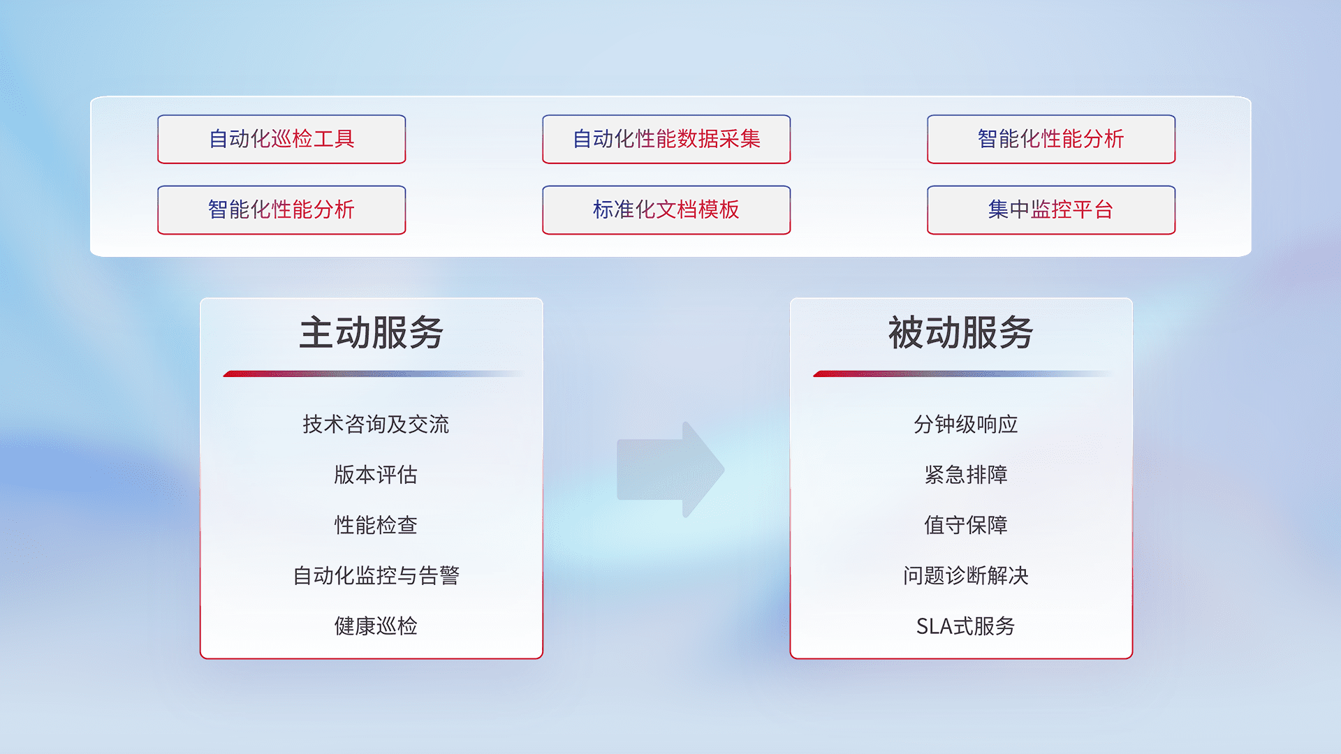 智能化工具和标准化文档,,,保障服务质量,,,,提供主动服务(包含技术咨询、、、、版本评估、、、性能检查、、、自动化监控与告警、、、、健康巡检)和被动服务包含(分钟级响应、、、、紧急排障、、、、值守保障、、、问题诊断解决、、、、SLA服务)。。。。